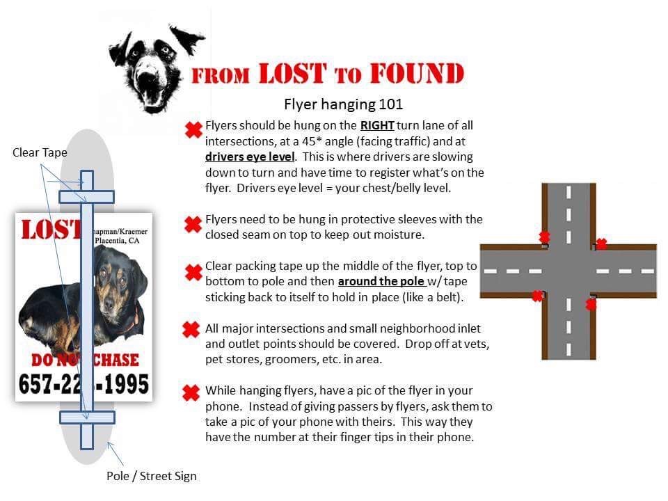 - Hanging street flyers is very important as a lot of people do not know to check social media when they have lost a pet.